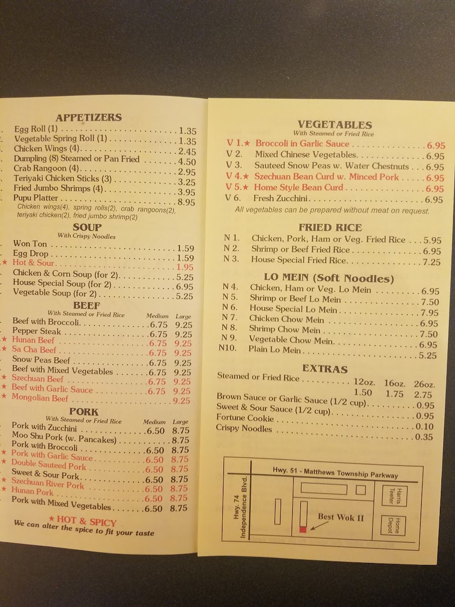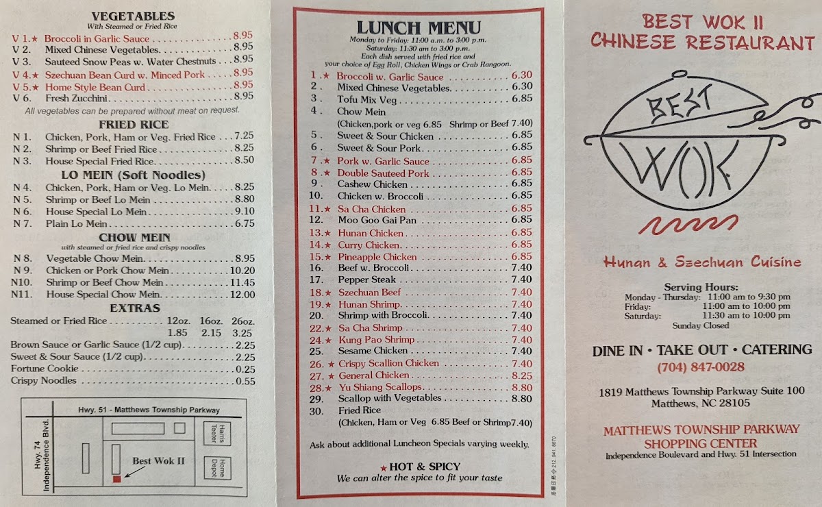 At Best Wok II Menu, you’ll find an exciting blend of flavors that reflect the heart of Asian cuisine. Located at 1819 Matthews Township Pkwy #100, Matthews, NC, this restaurant serves up dishes that are as delicious as they are diverse. Whether you're craving savory stir-fried noodles, fresh sushi, or a mouthwatering plate of fried rice, there’s something to satisfy every appetite. The menu features classic favorites like General Tso’s chicken and sweet and sour pork, along with chef specialties that bring a unique twist to traditional recipes. Perfect for a quick lunch or a cozy dinner, the options here are both tasty and generous in portion. Whatever you choose, the vibrant flavors and variety will keep you coming back for more!