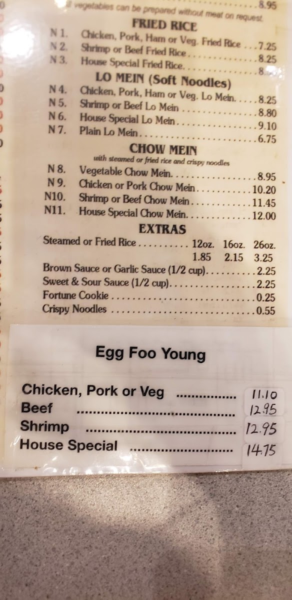 N1. Fried Rice with choice of chicken, ham, pork, or vegetables, mixed with eggs, peas, carrots, and onions.