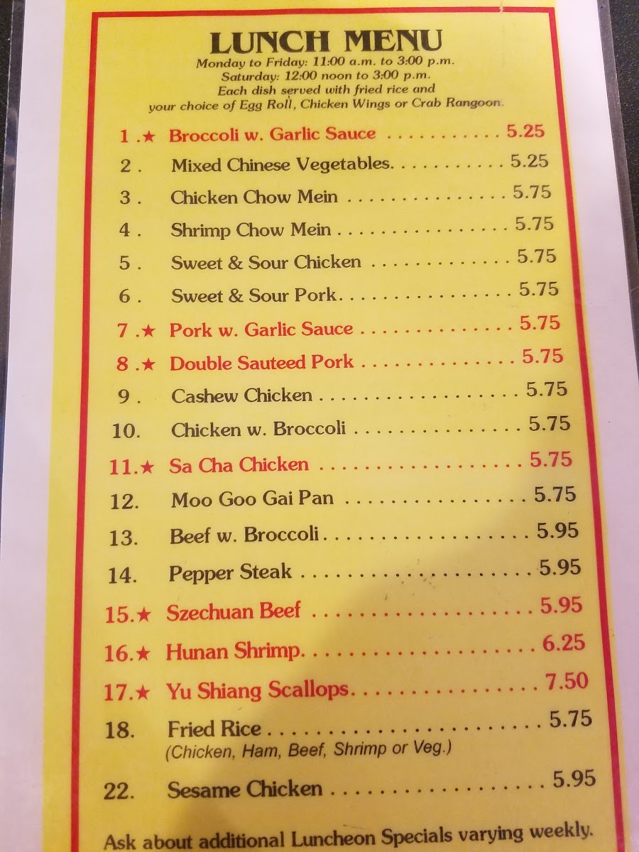 Boneless chicken chunks, marinated and quickly fried until crisp. Then sauteed with red pepper and broccoli in our special tangy sauce.