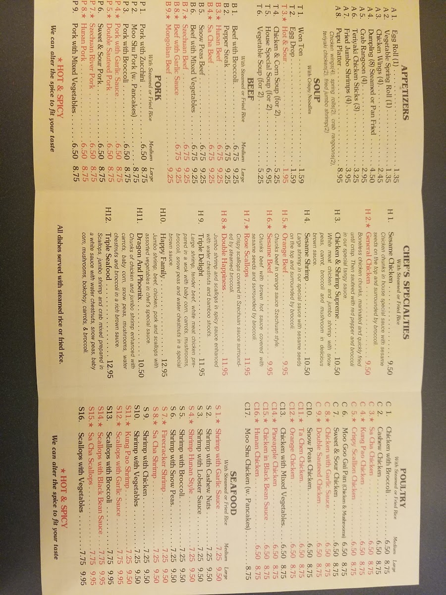 Large shrimp, tender beef, white meat chicken prepared in a wok with baby corn, carrots, mushrooms, broccoli, snow peas and water chestnuts in a special brown sauce.